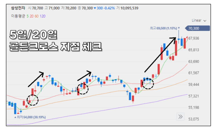 - 단기 MA가 장기 MA를 상향 돌파: 골든크로스 (매수 신호).