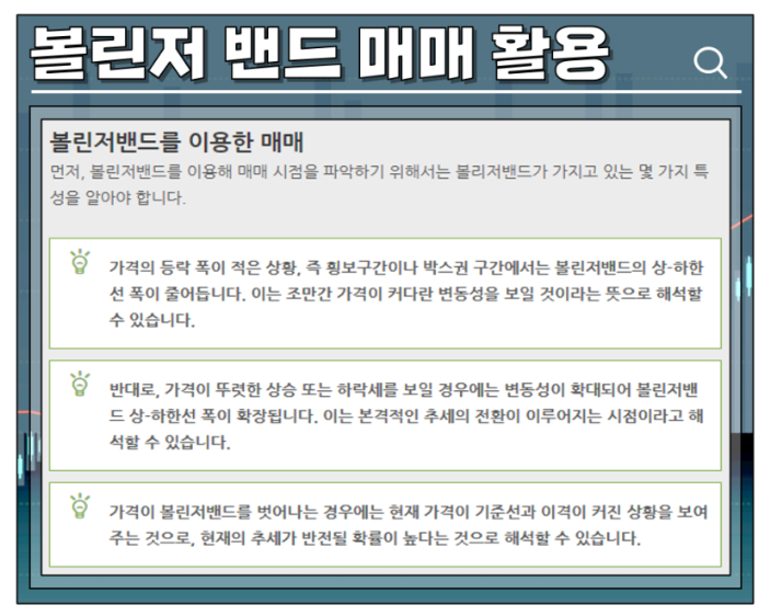 - 밴드 하단 접근 시: 매수 기회 (과매도 상태로 판단).