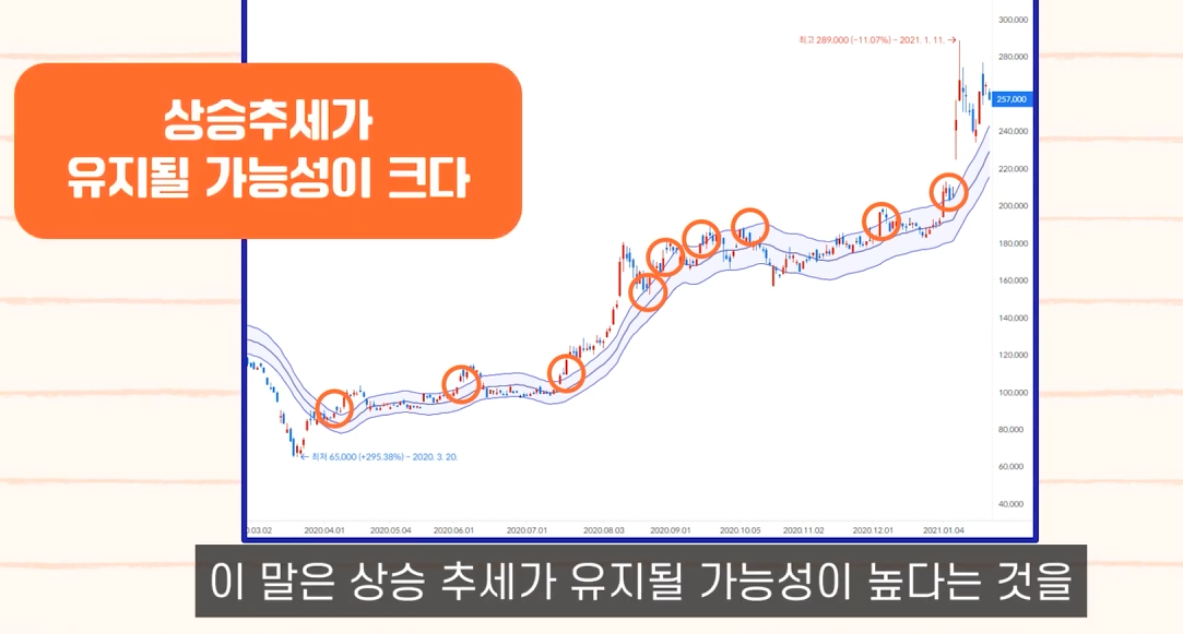 반대로 주가가 하단 밴드를 여러 번 건드리지만 주가 지표는 강세로 보일 때 주가 흐름의
