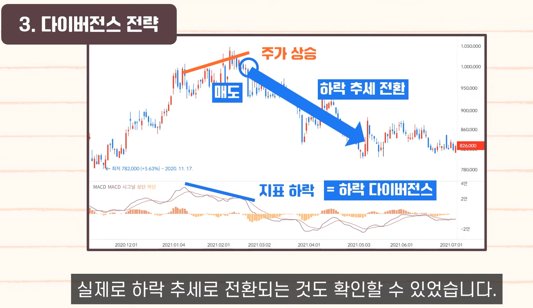- 거래량과 추세의 관계: 거래량이 추세와 반대로 움직이면 추세 반전 가능성이 높아짐.