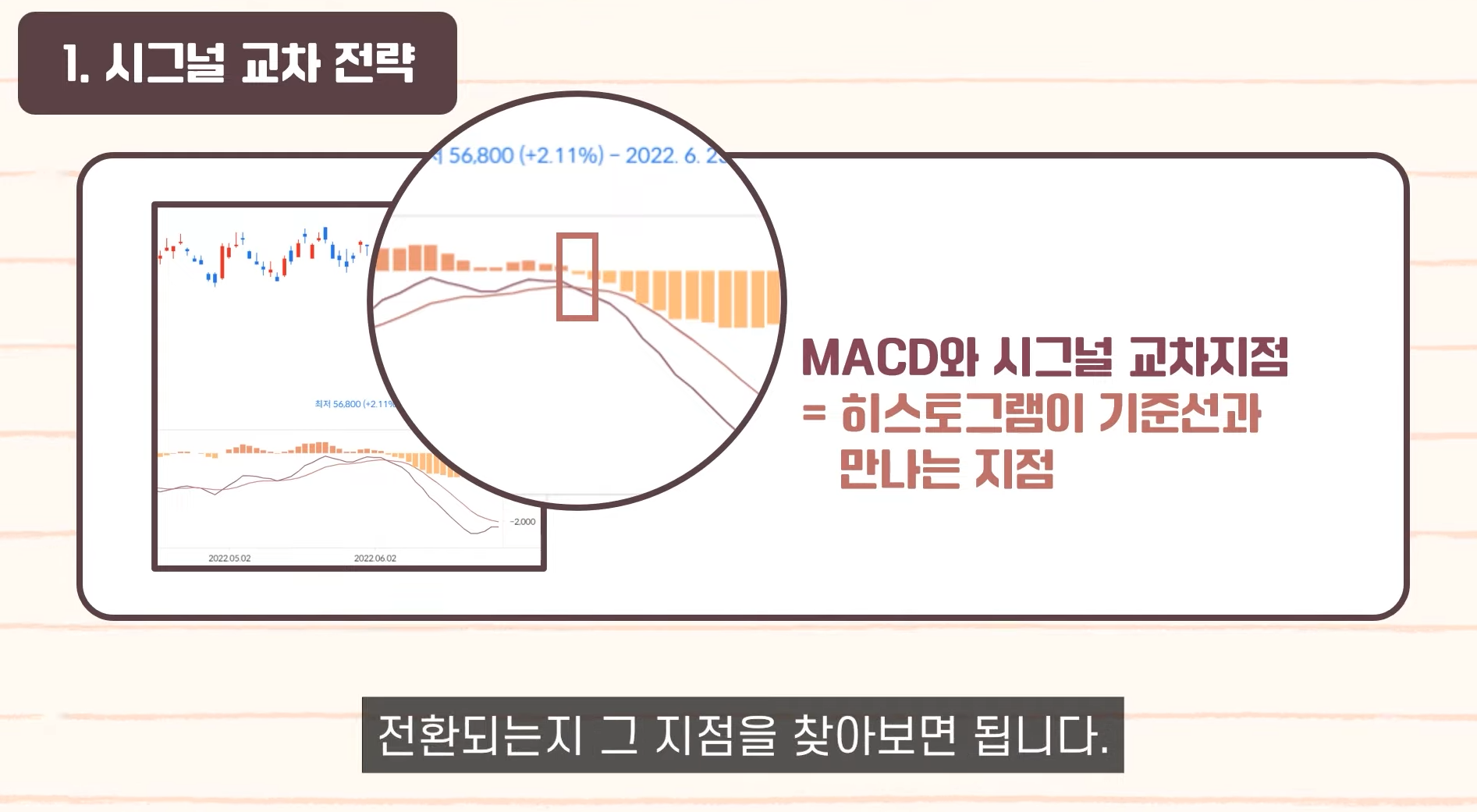 - 50 교차: 상승/하락 추세 전환 신호.