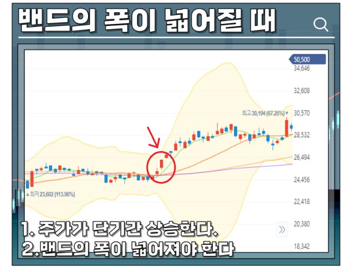 상승해 밴드의 폭이 넓어지는 시점입니다.