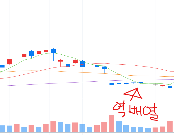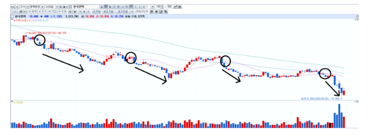 - 이동평균선 하락 후 대량거래 발생 → 주가 하락 예고.