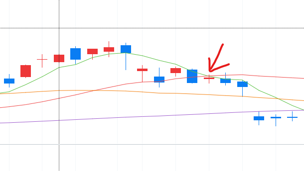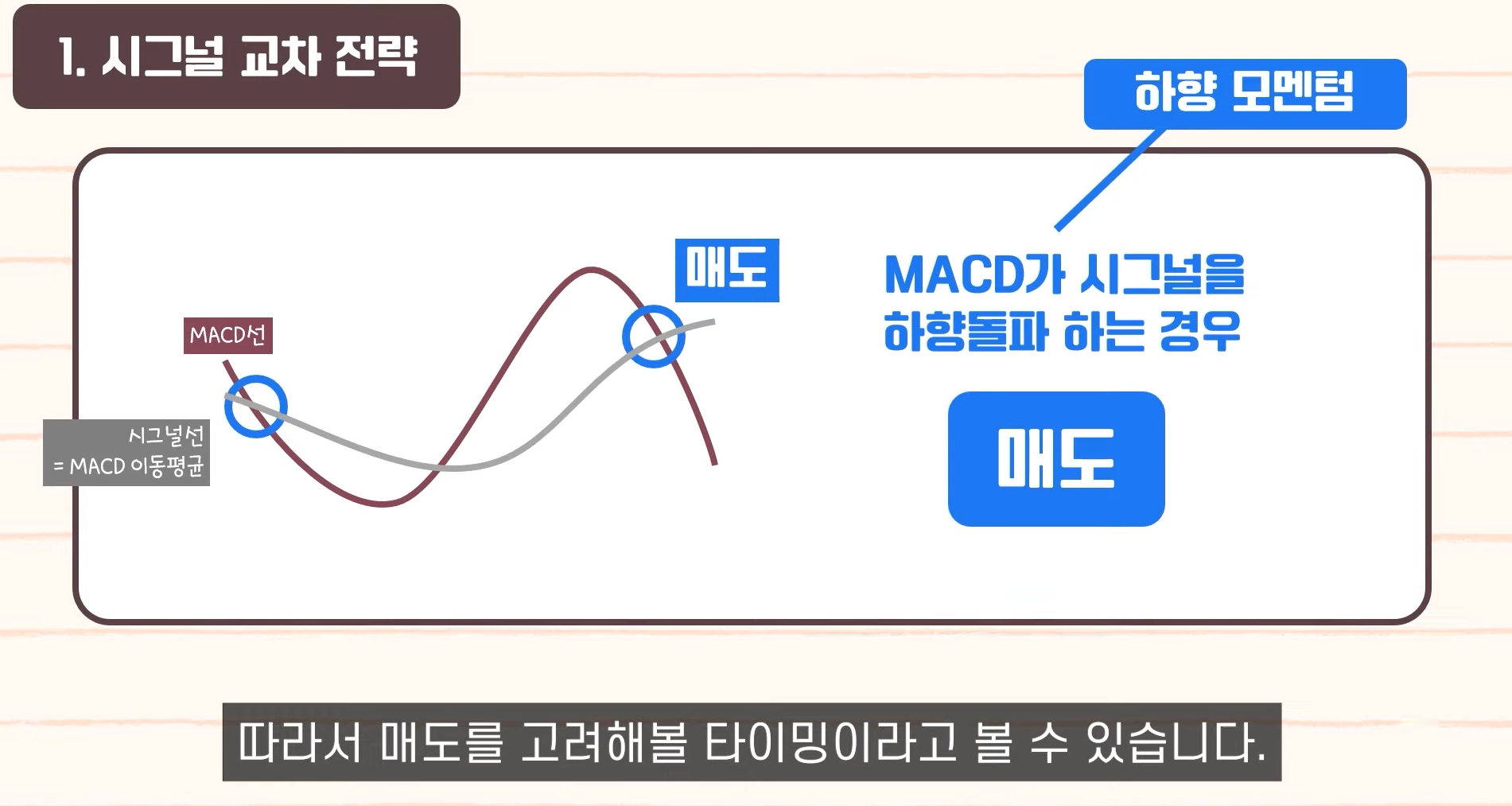 - 단기 MA가 장기 MA를 하향 돌파: 데드크로스 (매도 신호).