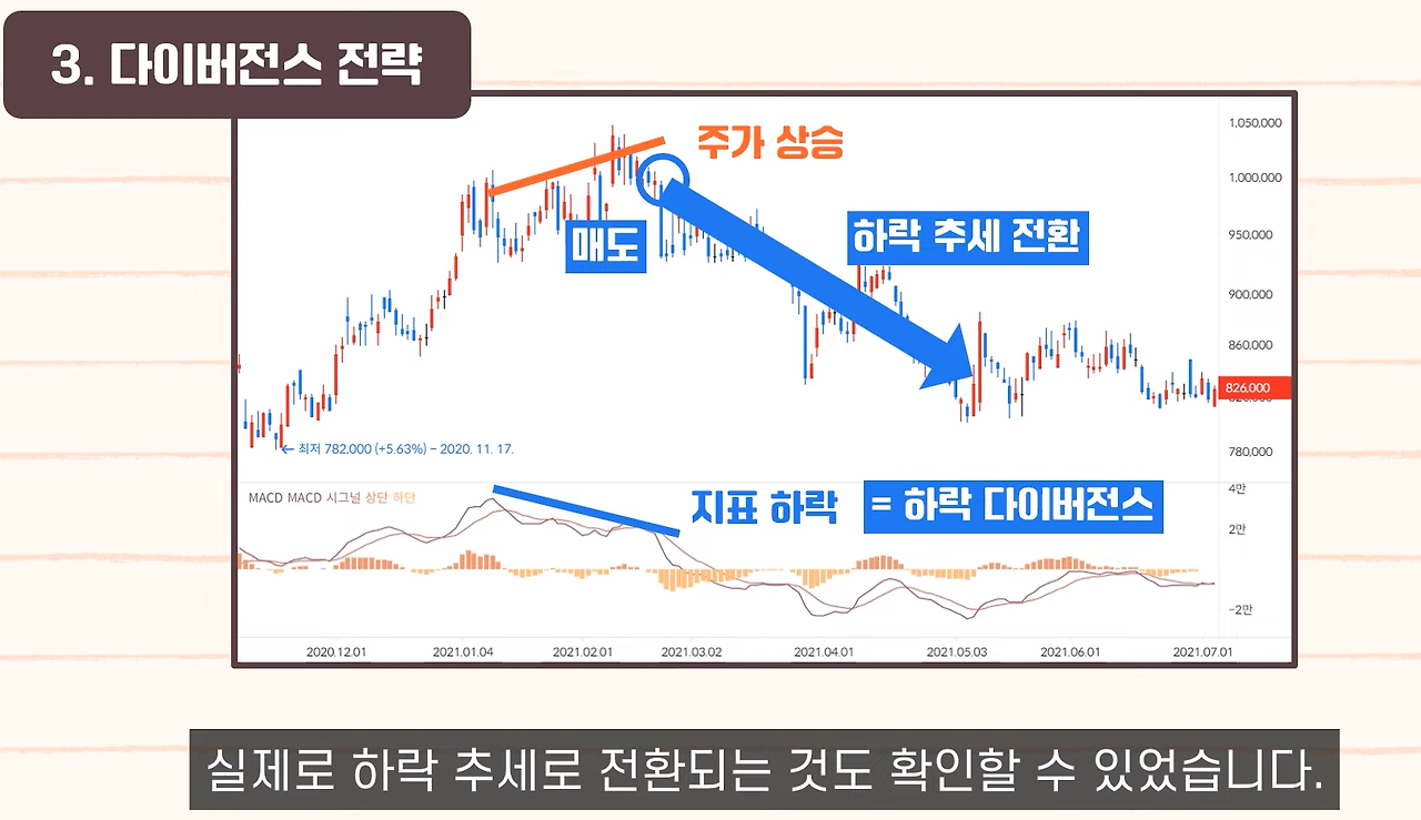 - MACD가 신호선을 하향 돌파: 매도 신호.