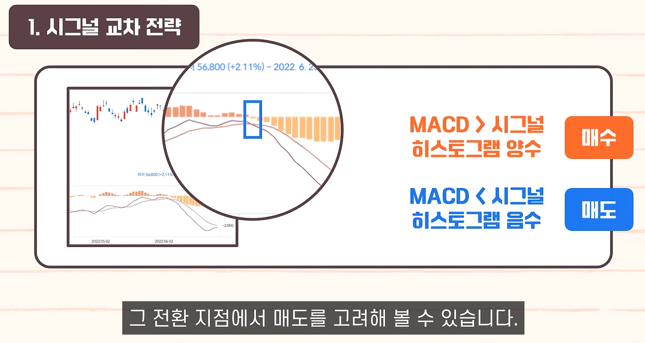 - MACD가 신호선을 상향 돌파: 매수 신호.