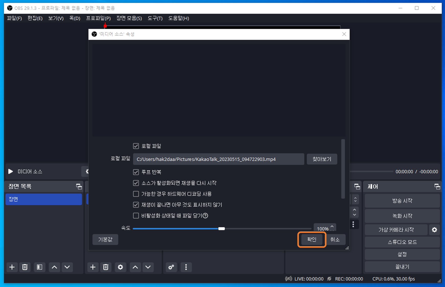 6. '확인'을 눌러서 미디이 소스 속성창을 닫습니다.