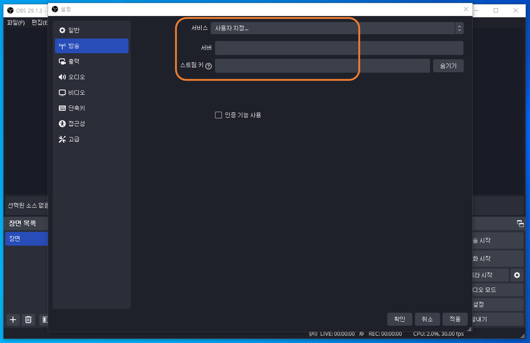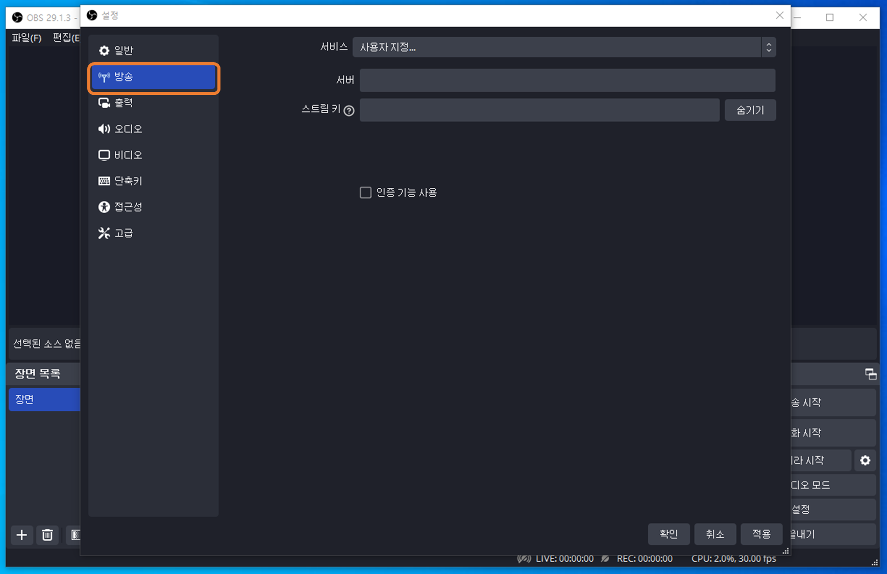 2. 설정창 -> '방송' 탭에 들어가면 입력하는 칸이 나옵니다.