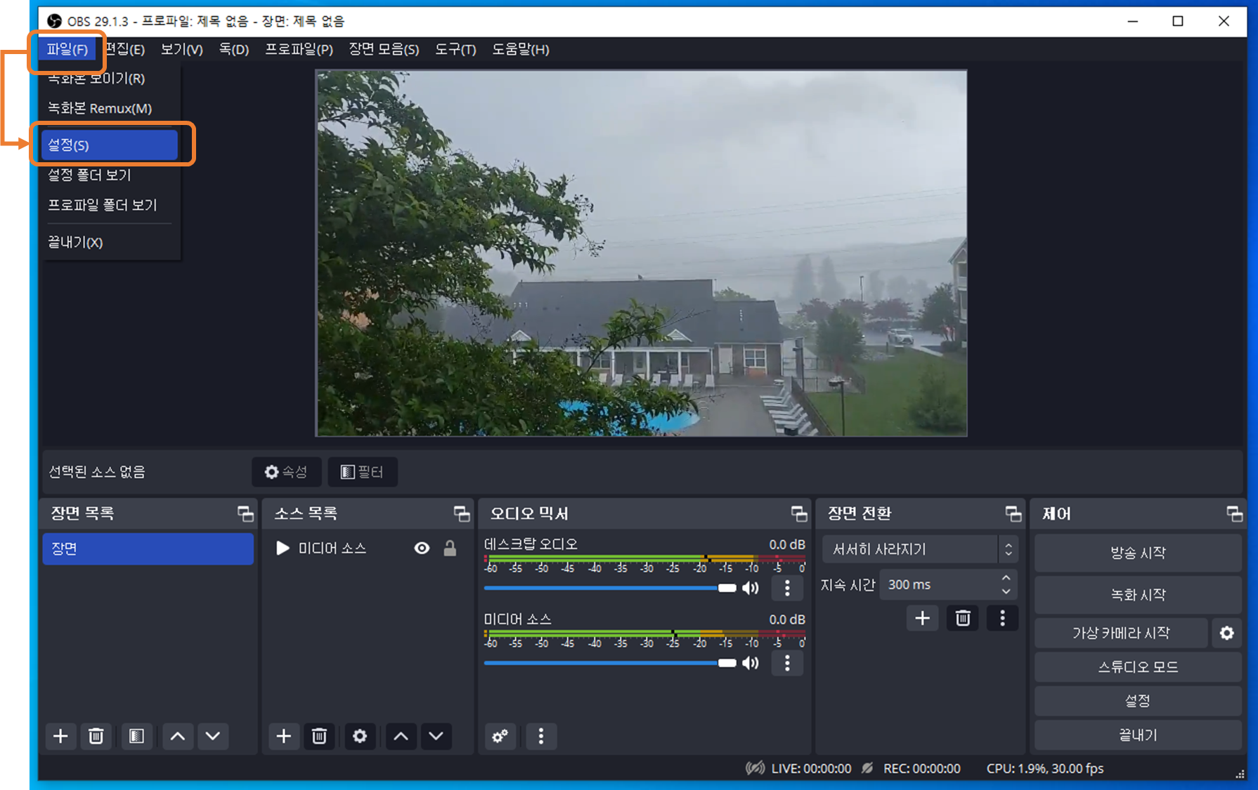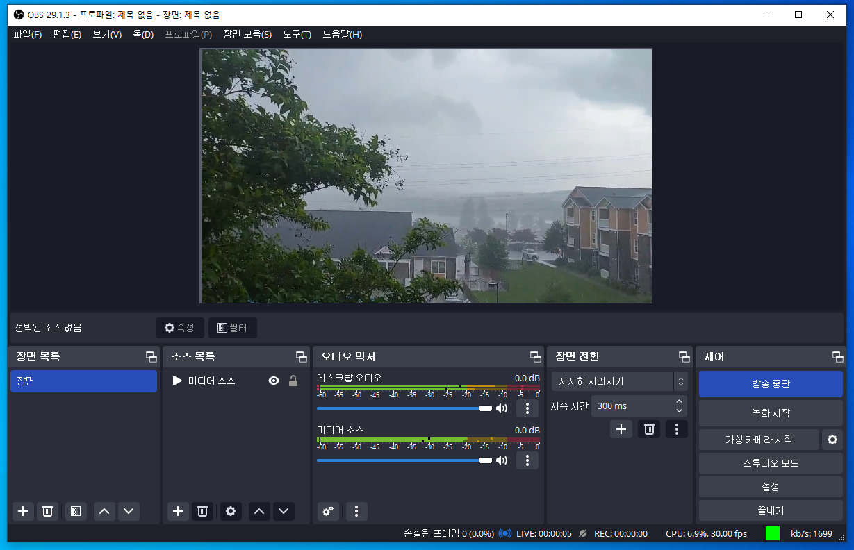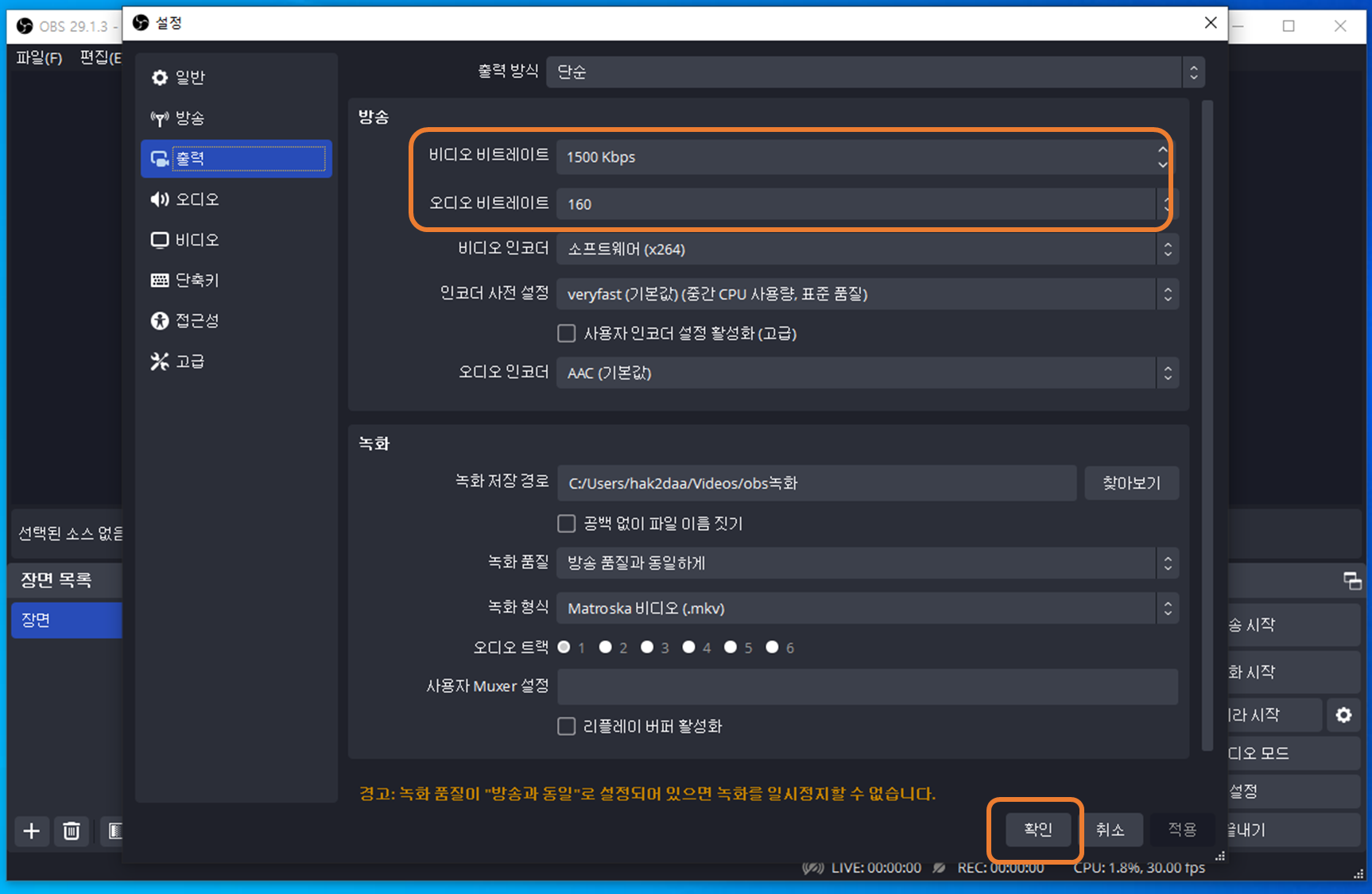 6. 우측 하단에 초록색 정사각형 / 출력비트레이트 표시가 나면 정상적으로 송출되고 있는 것