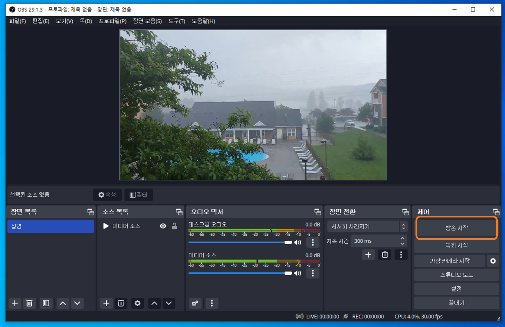 5. 설정이 다 맞으면 '방송시작' 클릭